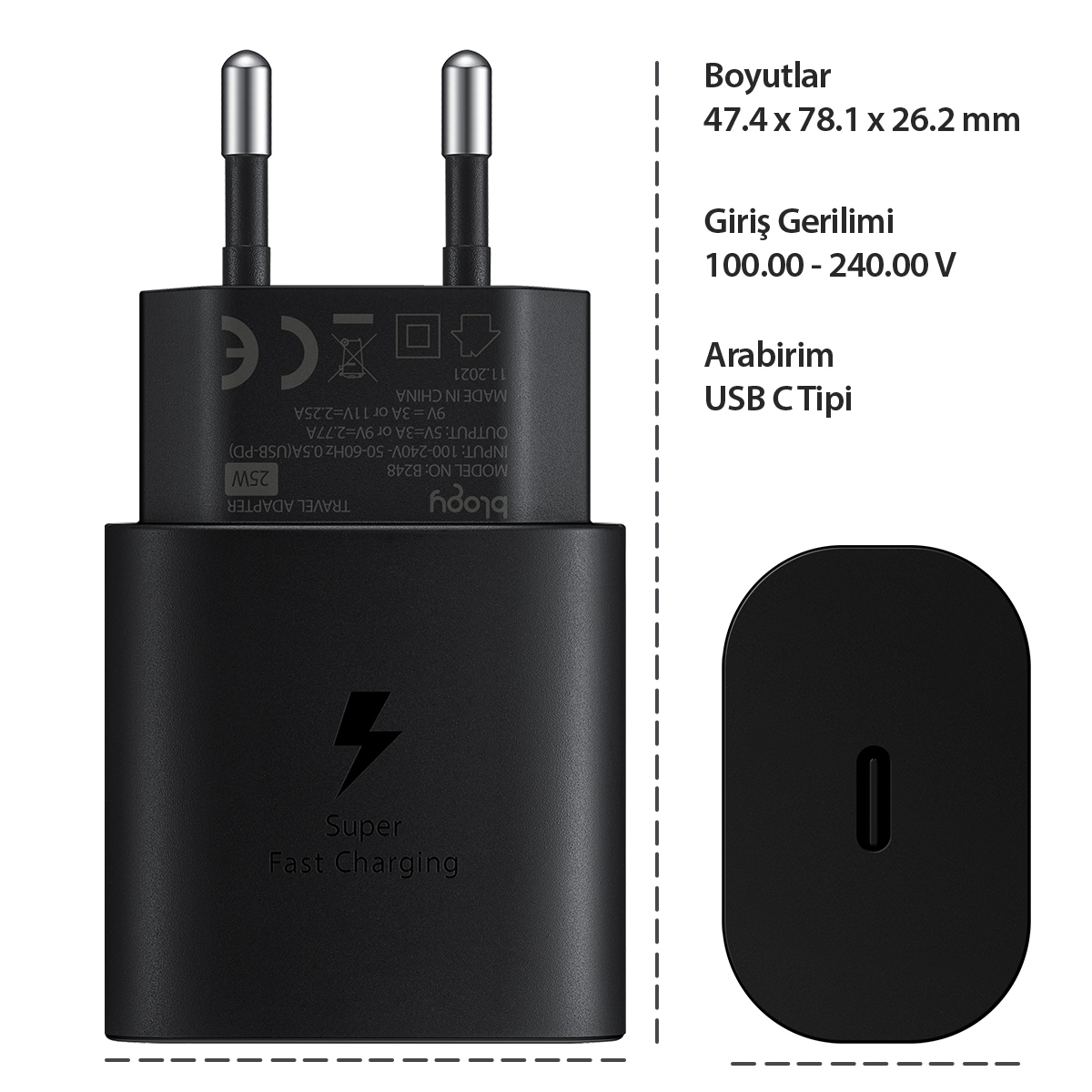 Her alana uygun ince tasarım Yerleşik çoklu Blogy koruma teknolojisi Şarj cihazının aşırı ısınmasını önler Paket İçeriği: 1 x Blogy Type C Şarj Cihazı