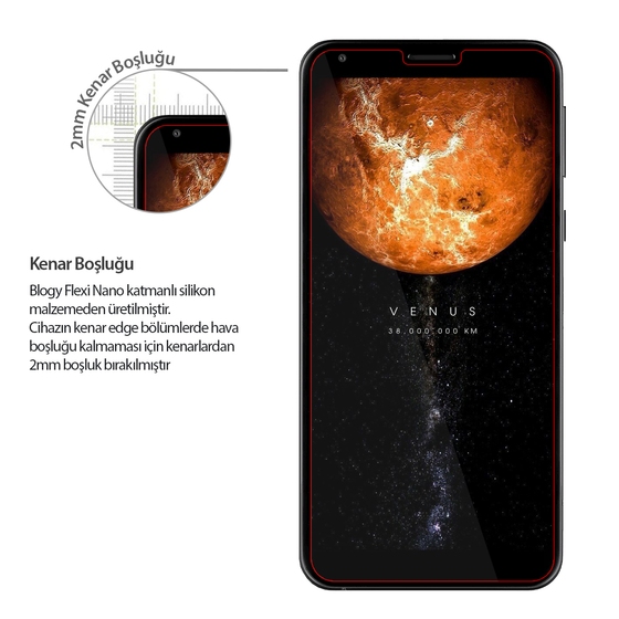 Blogy Flexi Nano, telefonunuzun ekranını günlük kullanımdan dolayı oluşan eskime, çizilmelere ve darbelere karşı korumaya yardımcı olur. Silikon malzemeden üretildiği için darbe aldığında cam ekran koruyuclar gibi çatlama-kırılma yapmaz