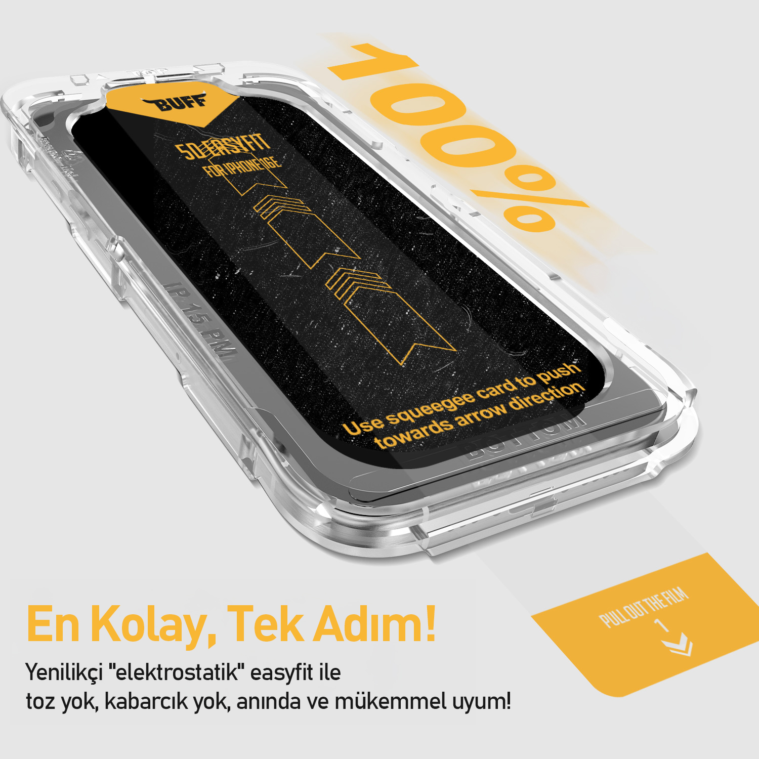 Buff EasyFit ekran koruyucu takarken harcanan zamanı en aza indirecek şekilde tasarlanmıştır. Paket içeriğinde bulunan uygulama aparatı sayesinde oldukça kolay bir şekilde kurulumu tamamlayabilirsiniz.