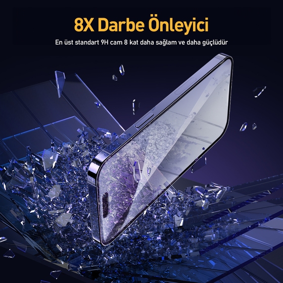 En üst standart 9H cam 8 kat daha sağlam ve daha güçlüdür. Güçlendirilmiş, çizilmeyi önlemeyici dayanlıklı temperli cam, darbelere karşı telefonunuzu korumaya yardımcı olur.