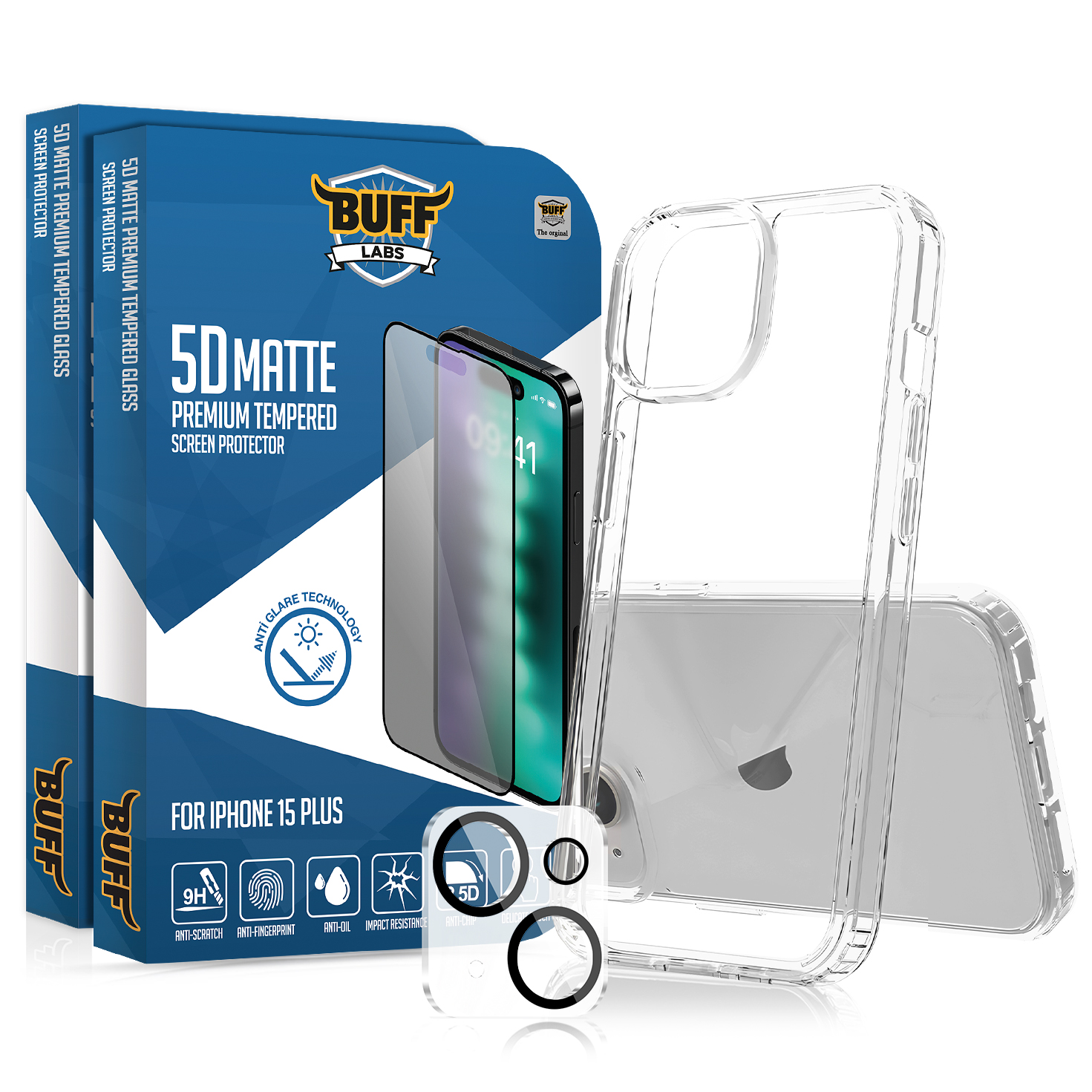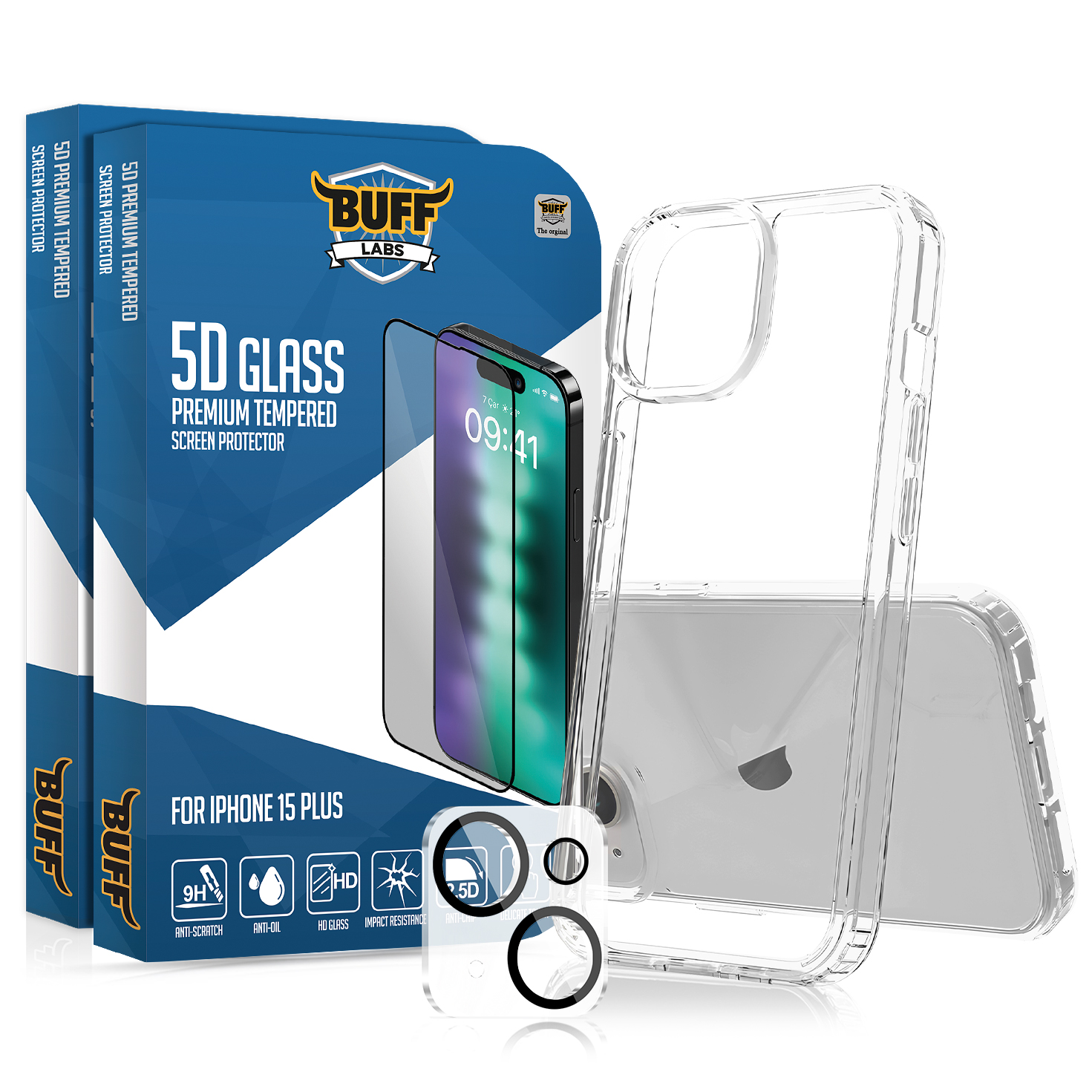 Buff iPhone 15 Plus Avantaj Paket - 2x5D Ekran Koruyucu + Şeffaf Kılıf + Lens Koruyucu