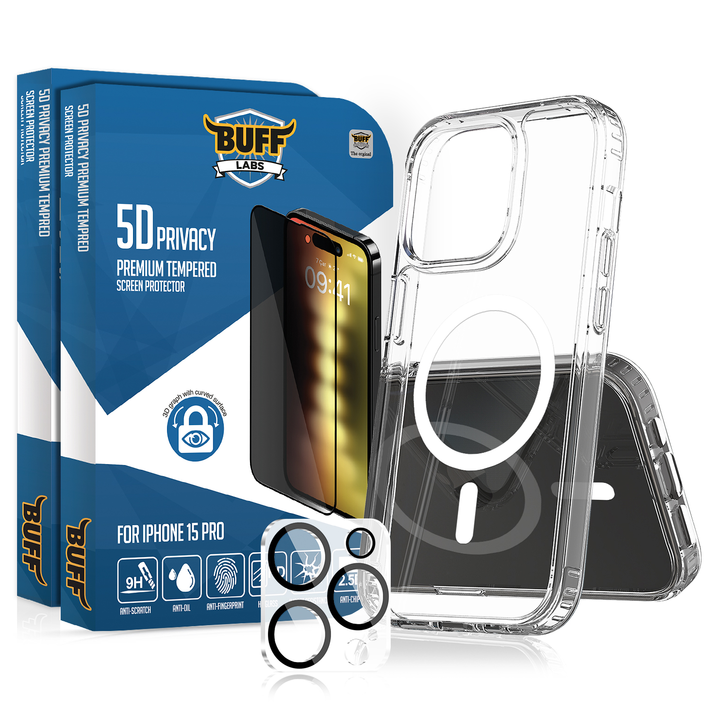 Buff iPhone 15 Pro Avantaj Paket - 2x5D Ekran Koruyucu + MagSafe Kılıf + Lens Koruyucu