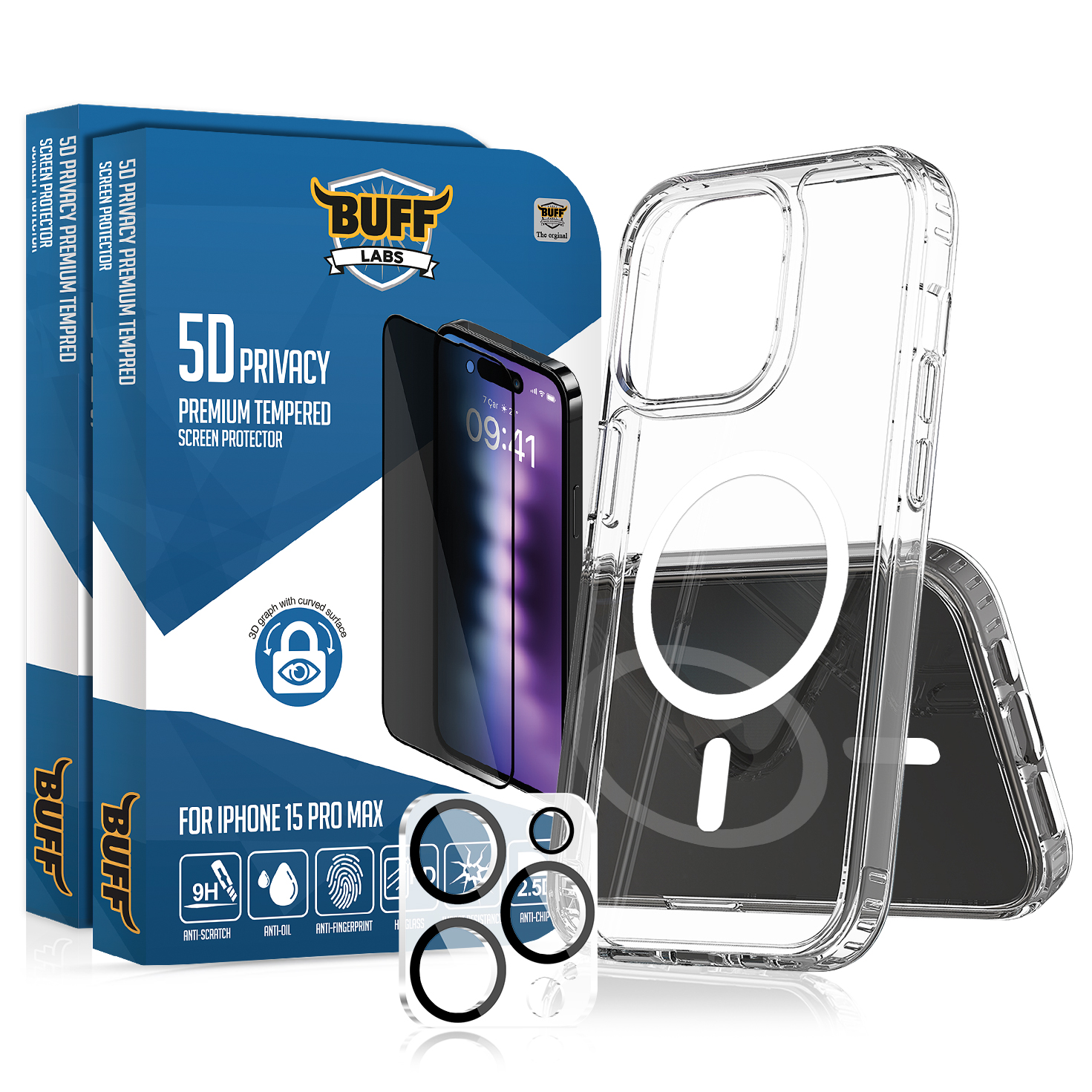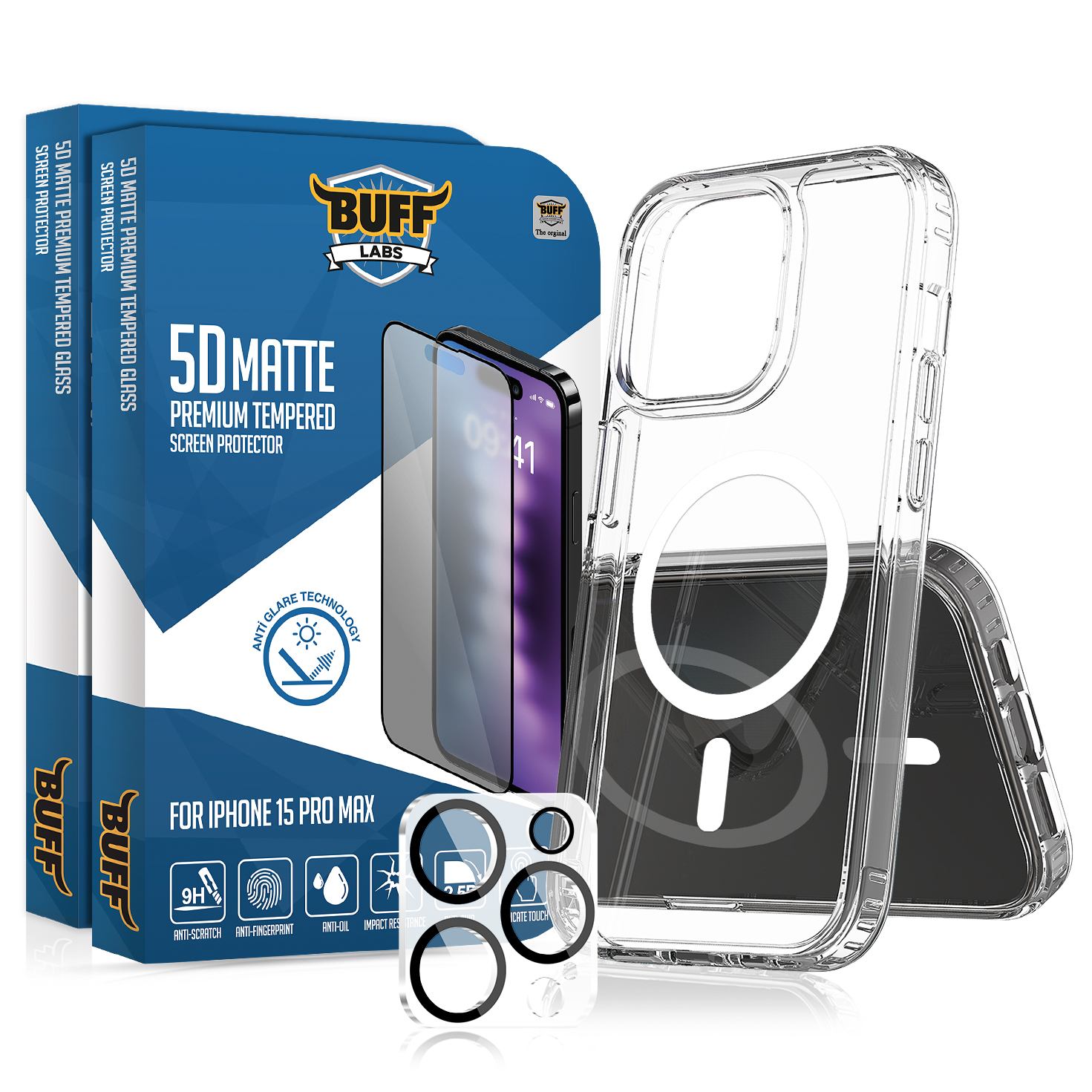 Buff iPhone 15 Pro Max Avantaj Paket - 2x5D Ekran Koruyucu + MagSafe Kılıf + Lens Koruyucu