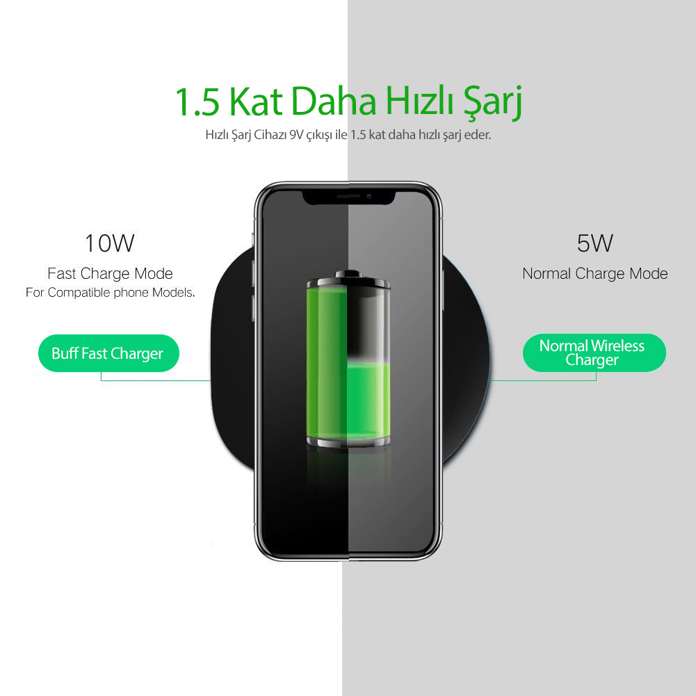 Buff NT1 Wireless Charger kablosuz şarj standartlarına uygundur, güvenilir ve rahat bir şekilde kullanabilirsiniz. iPhone 11, 11 Pro, 11 Pro Max, Xs, XR, X, iPhone 8, iPhone 8 Plus, Galaxy Note 8, Galaxy S8, Galaxy S8 Plus, Galaxy S7 Edge ve kablosuz şarj özelliği olan cihazlarla uyumludur.
